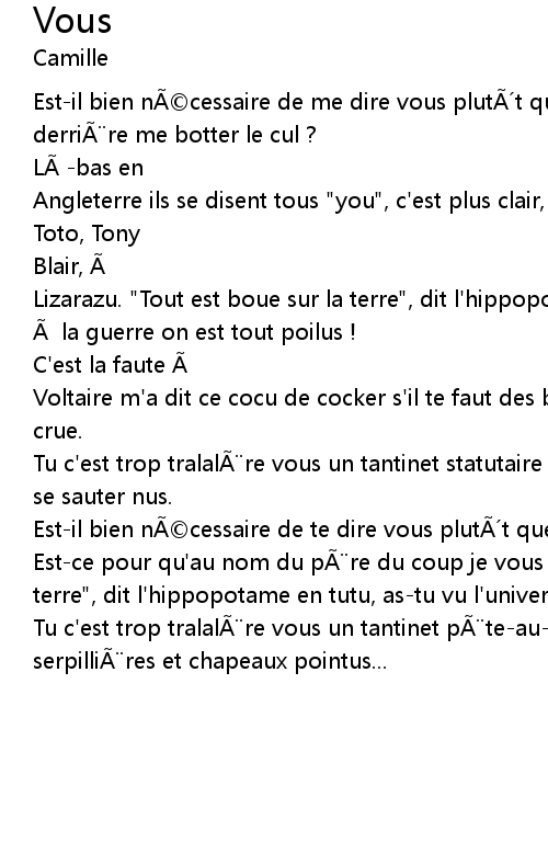 | Estce pour qu' au nom du p re du coup je vous tue ? ... " Tout est boue sur la terre", dit l' hippopotame en tutu, astu vu l' univers quand il ternue ? | |
