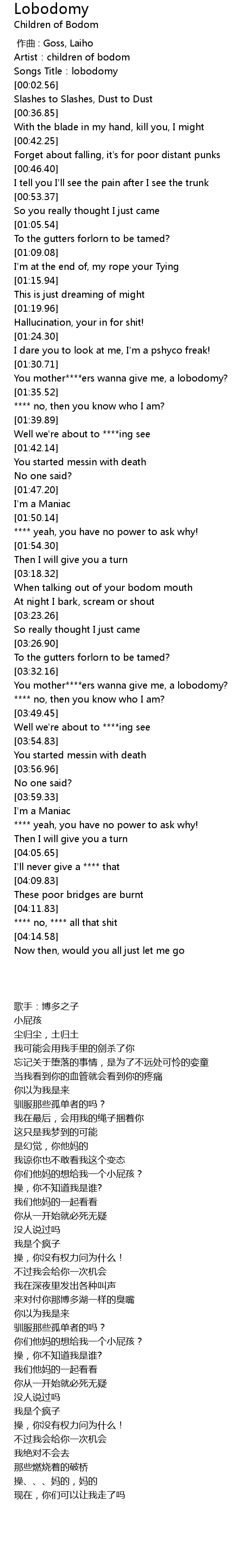 | [01:33.33] | You mother****ers wanna give me, a lobodomy? |
