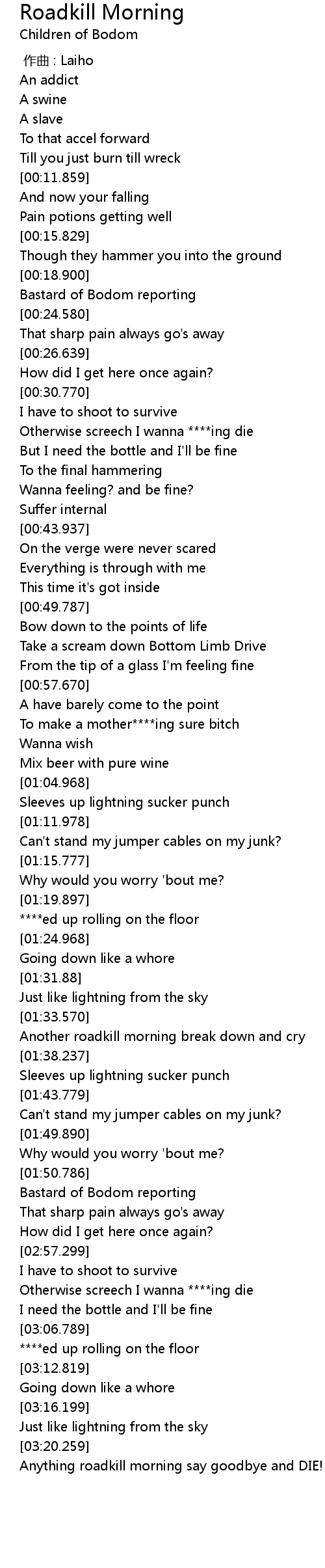 | [03:22.999] | Anything roadkill morning say goodbye and DIE! |