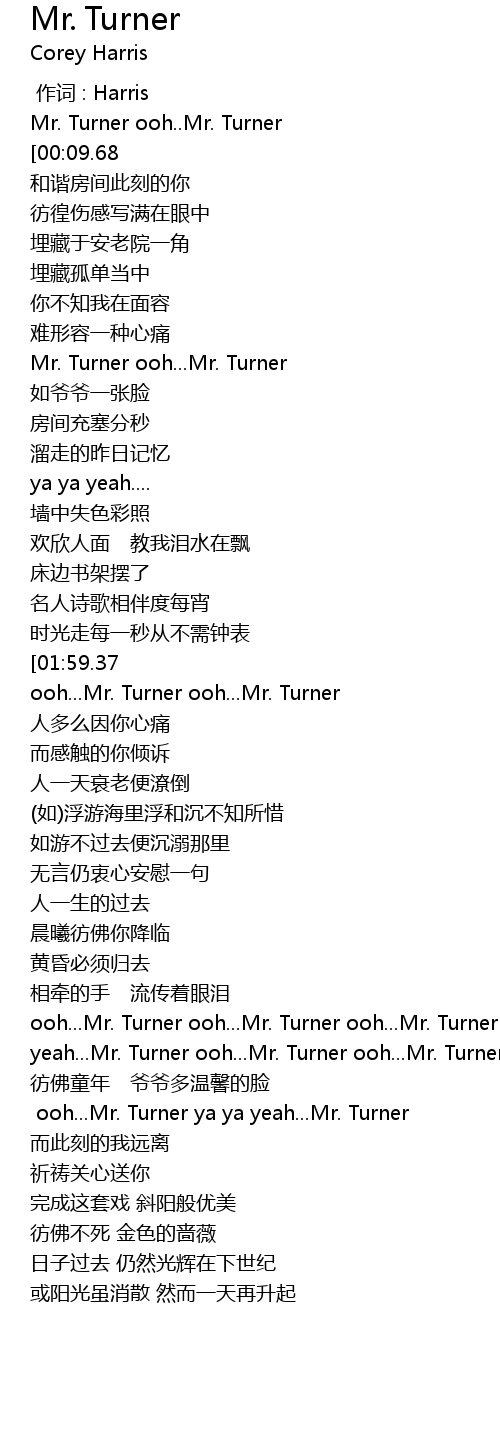 | [03:33.57][01:59.37] | Mr. Turner ooh... Mr. Turner |