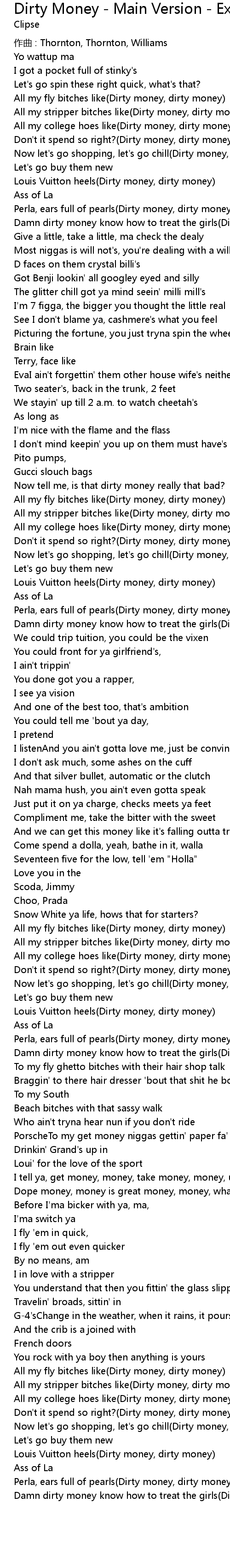 | All my fly bitches like Dirty money, dirty money | |