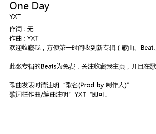 | 歌曲发表时请注明“歌名(Prod by 制作人)” 歌词栏作曲/编曲注明”YXT“即可。 |