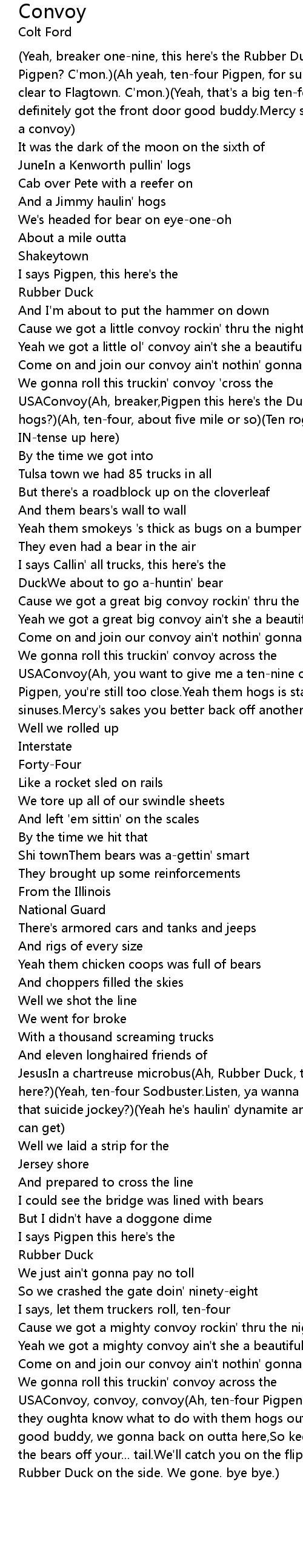 USAConvoy, convoy, convoy(Ah, ten-four Pigpen. What's your twenty? OMAHA?Well they oughta know what to do with them hogs out there, for sure.Well mercy sakes good buddy, we gonna back on outta here,So keep your thumbs off your glass and the bears off your... tail.We'll catch you on the flip-flop.This here's the Rubber Duck on the side. We gone. bye bye.) |