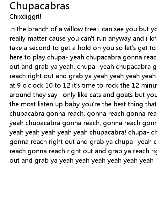 in the branch of a willow tree i can see you but you can't see me i doesn't really matter cause you can't run anyway and i know what i wanna do it'll only take a second to get a hold on you so let's get to business cause i didn't come here to play chupa- yeah chupacabra gonna reach, gonna reach gonna reach right out and grab ya yeah, chupa- yeah chupacabra gonna reach, gonna reach gonna reach right out and grab ya yeah yeah yeah yeah yeah yeah chupacabra! get stuck at 9 o'clock 10 to 12 it's time to rock the 12 minute baby i ain't gonna mess around they say i only like cats and goats but you're the kind of prey i like the most listen up baby you're the best thing that i've found chupa- yeah chupacabra gonna reach, gonna reach gonna reach right out and grab ya chupa- yeah chupacabra gonna reach, gonna reach gonna reach right out and grab ya yeah yeah yeah yeah yeah yeah chupacabra! chupa- chupacabra gonna reach, gonna reach gonna reach right out and grab ya chupa- yeah chupacabra gonna reach, gonna reach gonna reach right out and grab ya reach right out and grab ya reach right out and grab ya yeah yeah yeah yeah yeah yeah |