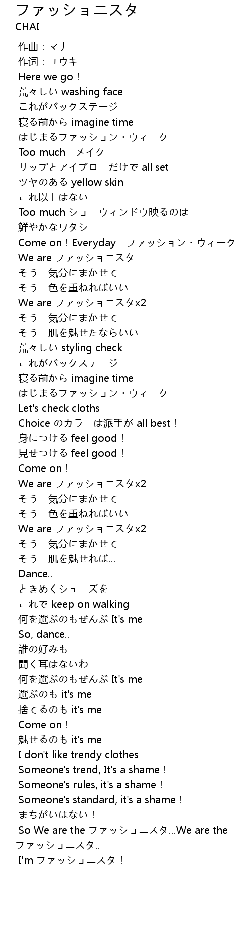| [02:17.004] | So We are the ファッショニスタ...We are the ファッショニスタ.. |