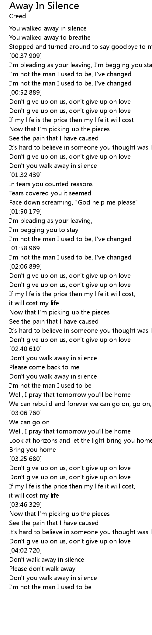 | [04:04.150] | Don' t walk away in silence |