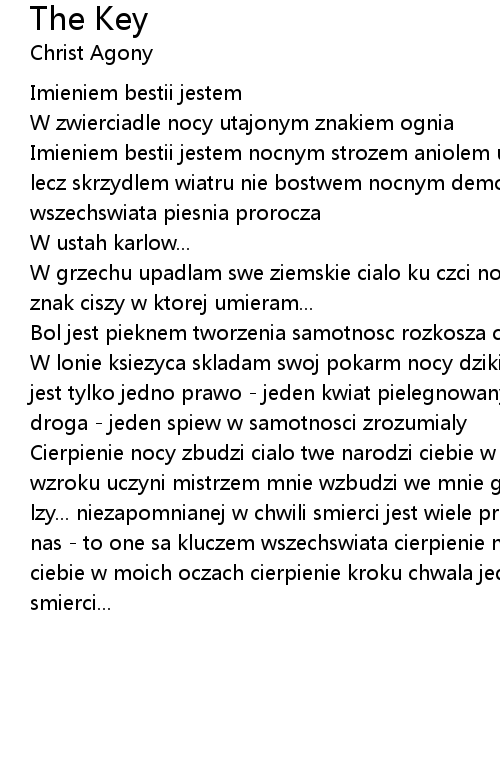 Imieniem bestii jestem nocnym strozem aniolem upadlym u bram piekiel nie ptakiem lecz skrzydlem wiatru nie bostwem nocnym demonem nie ptakiem lesz kluczem wszechswiata piesnia prorocza