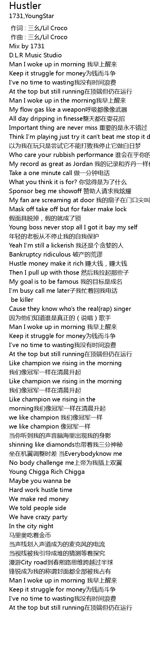 | [01:05.741] | Hustle money make it rich 赚大钱,赚大钱 |