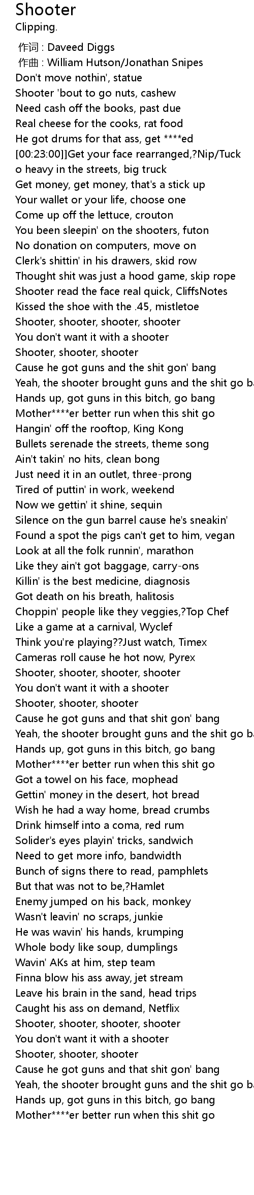 | [01:00:13] | Yeah, the shooter brought guns and the shit go bang |
