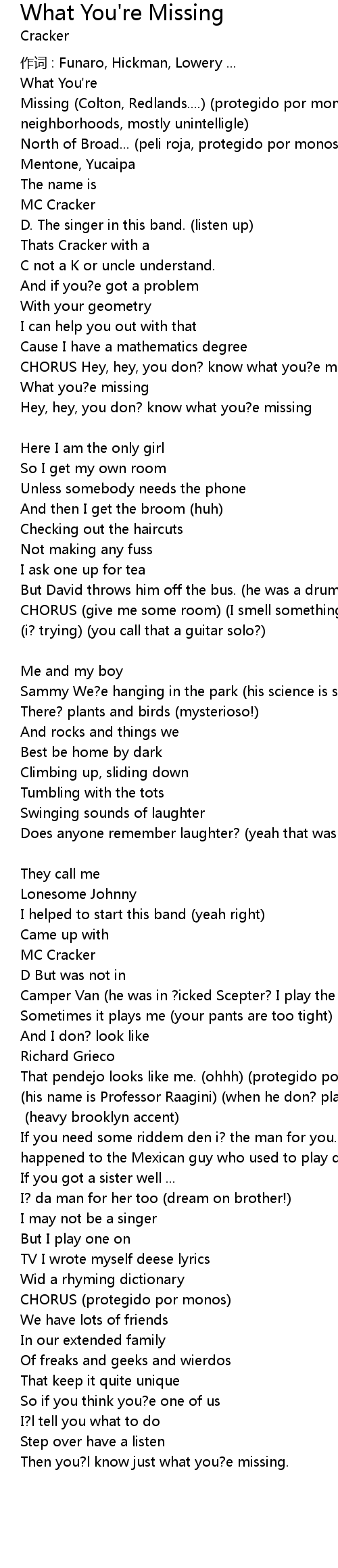 | CHORUS Hey, hey, you don? know what you? e missing | |