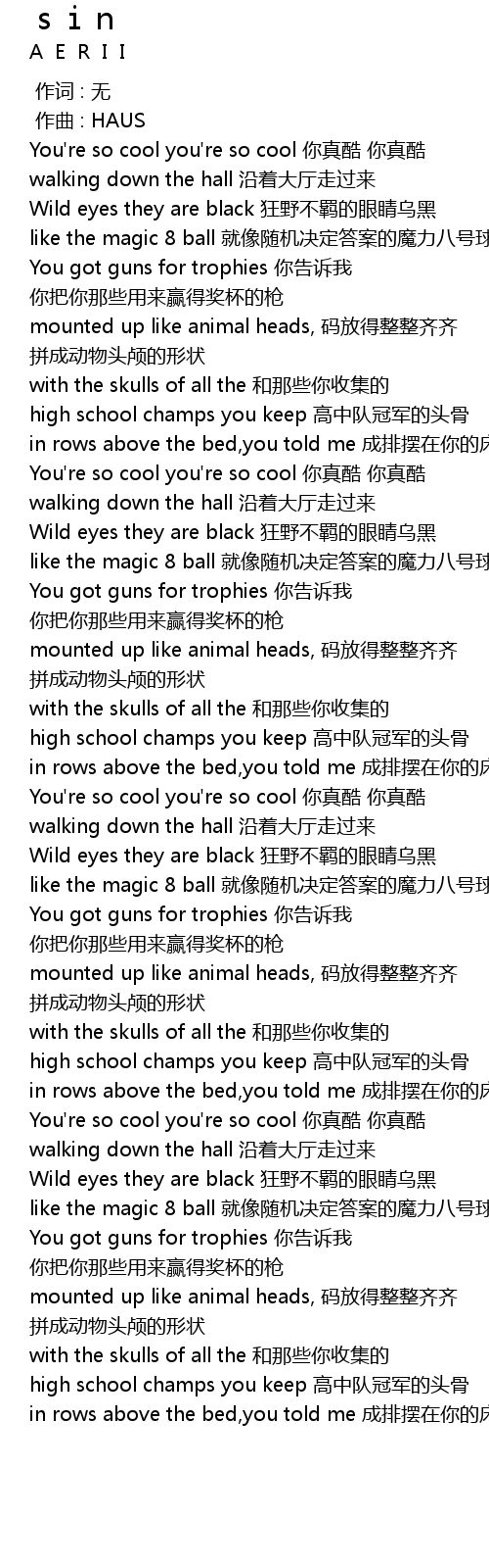 | [02:26.698] | You got guns for trophies nǐ gào sù wǒ nǐ bǎ nǐ nèi xiē yòng lái yíng de jiǎng bēi de qiāng |