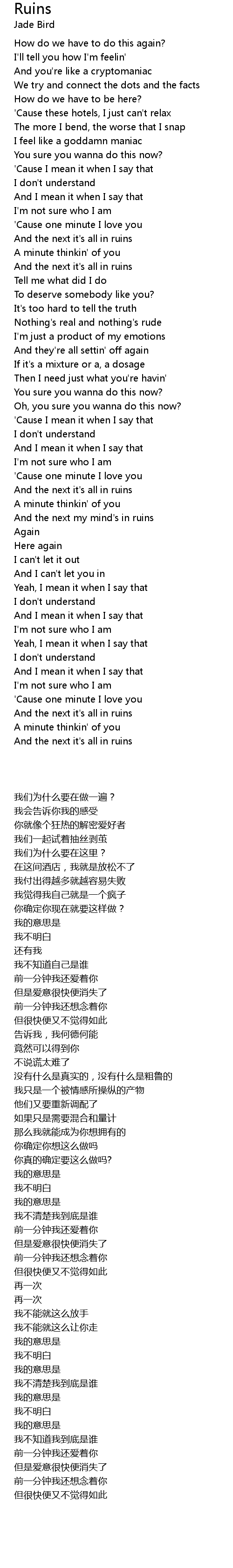 And the next my mind's in ruins |