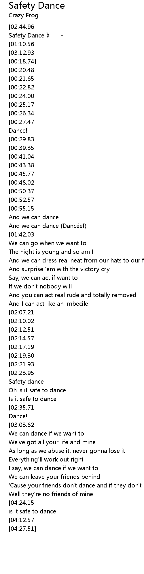 | [04:26.49][04:24.15][04:21.85][04:19.41][04:14.86][04:10.27][04:05.51][04:00.90] | Oh is it safe to dance |