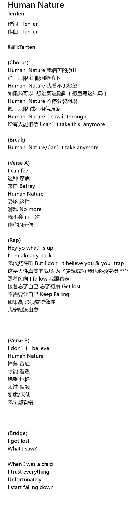 | Human Nature wǒ tòng kǔ de zhēng zhá | |
