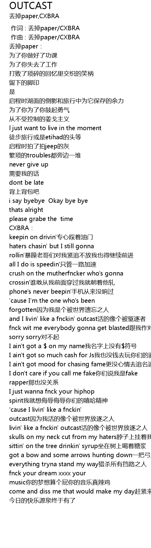 | [01:23.250] | ' cause I livin' like a fnckin' outcast yīn wèi wǒ huó de xiàng gè bèi shì jiè fàng zhú zhī rén |