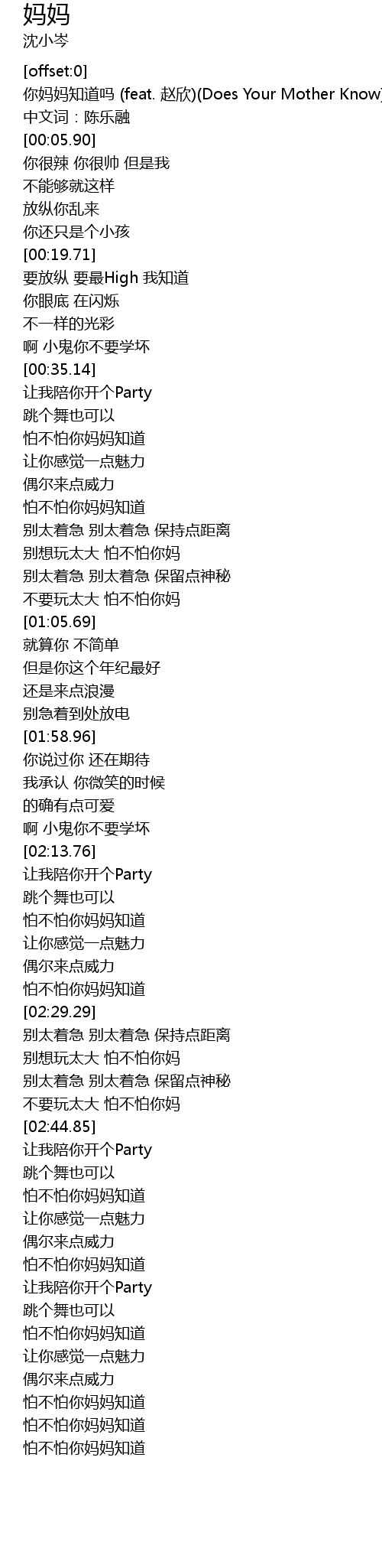 | [00:00.84] | ni ma ma zhi dao ma feat. zhao xin Does Your Mother Know shen xiao cen |