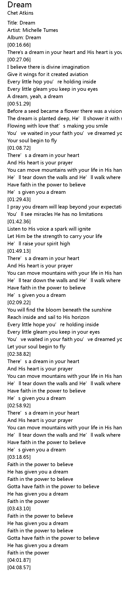 | [00:20.12] | There's a dream in your heart and His heart is your prayer... |
