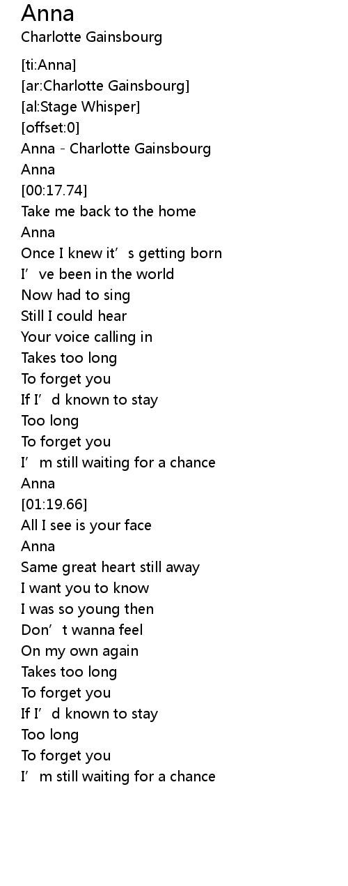 | [00:00.73] | Anna - Charlotte Gainsbourg |