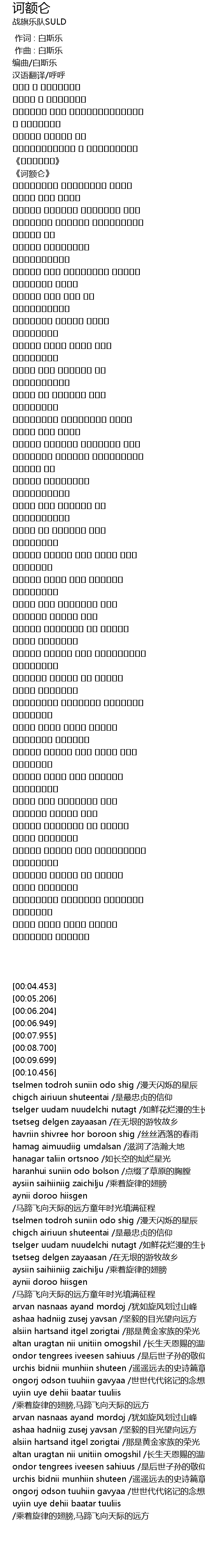 | [04:13.096] | uyiin uye dehii baatar tuuliis /乘着旋律的翅膀,马蹄飞向天际的远方 |