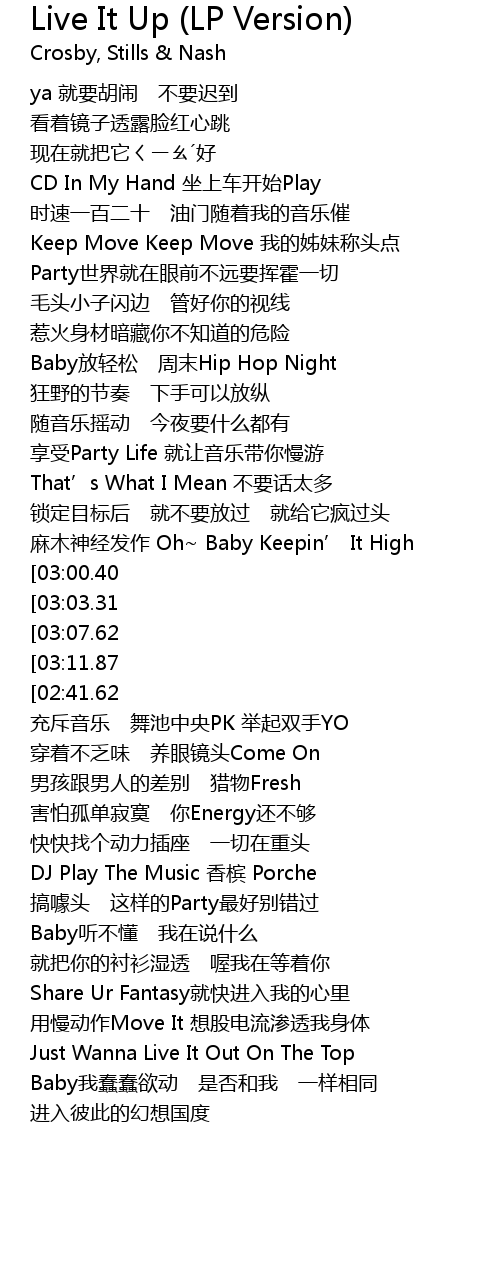 | [03:22.79][03:03.31][02:28.59][01:17.14] | Live It Up 看你Show Ur Body 惹火 |