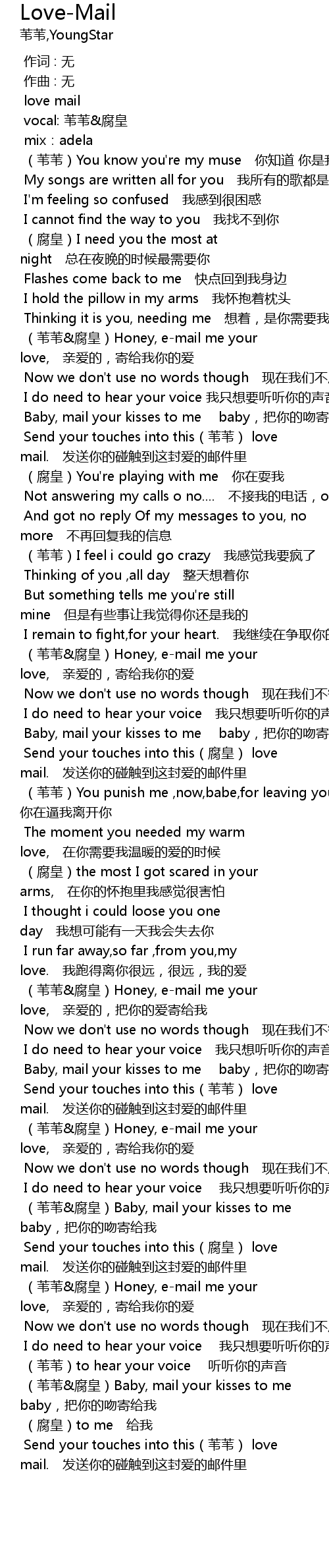 | [02:34.097] | (苇苇&腐皇)Honey, e-mail me your love, 亲爱的,把你的爱寄给我 |