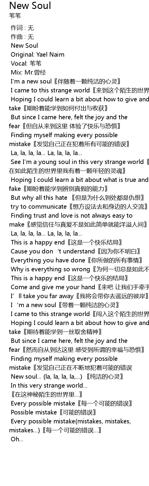 | [02:13.327] | I‘m a new soul〖带着一颗纯洁的心灵〗 |
