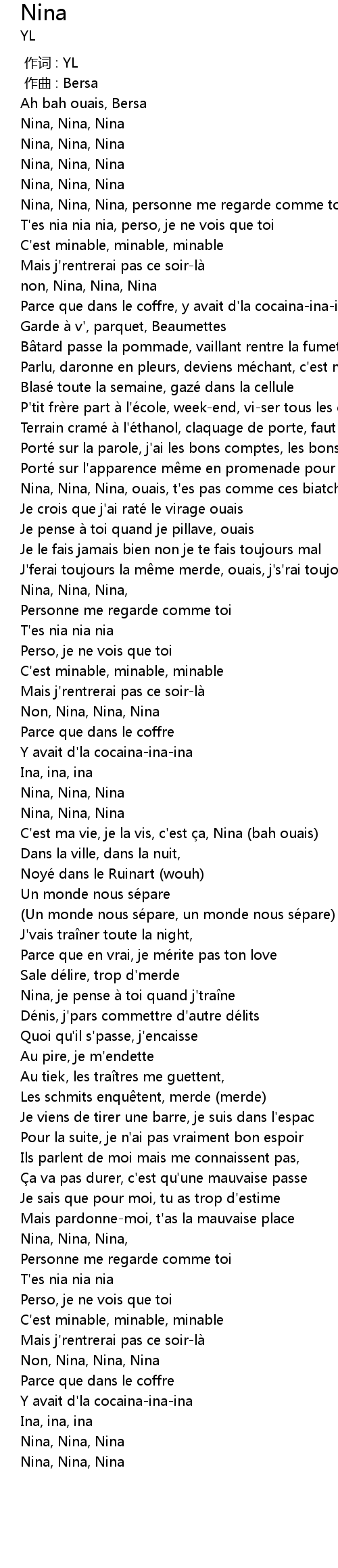 | [01:18.90] | Nina, Nina, Nina, ouais, t'es pas comme ces biatchs, ouais |
