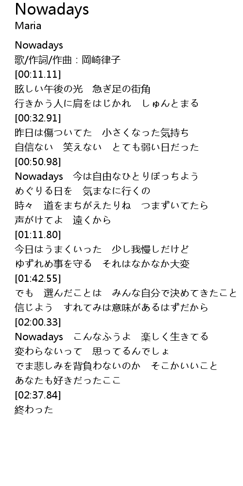 | [02:17.67] | Nowadays こんなふうよ 楽しく生きてる |
