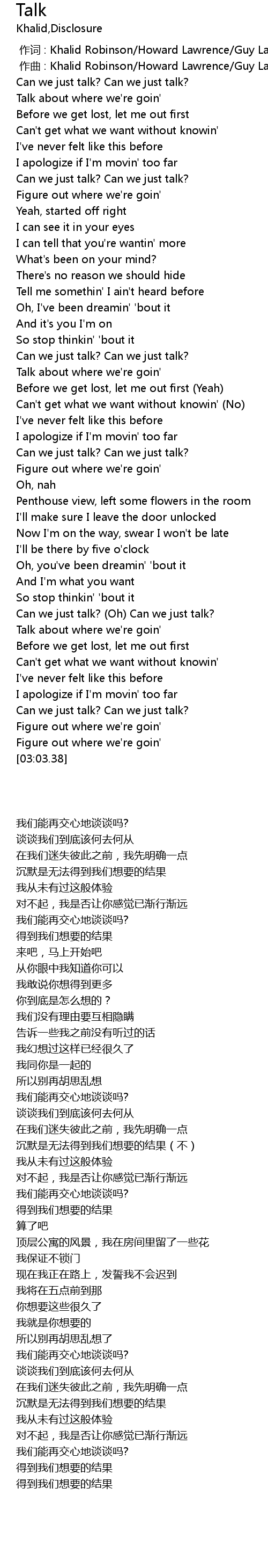 | [00:01.000] | zuo qu : Khalid Robinson Howard Lawrence Guy Lawrence |
