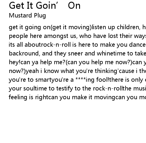 get it going on(get it moving)listen up children, heed the words i saythere are people here amongst us, who have lost their waysome people have forgotten what its all aboutrock-n-roll is here to make you dance and shoutthey cower in the backround, and they sneer and whinetime to take it back,do ya hear my cry...hey, hey!can ya help me?(can you help me now?)can ya break me?(can you break me now?)yeah i know what you're thinking'cause i thought it toobut if you think you're to smartyou're a ****ing fool!there is only one salvation that can save your soultime to testify to the rock-n-rollthe musics coming harder and the feeling is rightcan you make it movingcan you move it tonight |