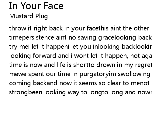 throw it right back in your facethis aint the other placethis aint the other timepersistence aint no saving gracelooking back'cause you know better than to try mei let it happeni let you inlooking backlooking backto realize what i hadim looking forward and i wont let it happen, not againnot gonna wait til im deadthe time is now and life is shortto drown in my regretright now it seems so clear to mewe spent our time in purgatoryim swollowing my pride for the last timewe're coming backand now it seems so clear to menot gonna let it happenwe're twice as strongbeen looking way to longto long and nownot gonna happen not again
