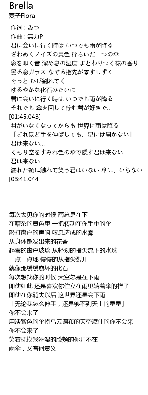 | [03:34.666] | 笑着抚摸我淋湿的脸颊的你并不在 雨伞,又有何意义 |