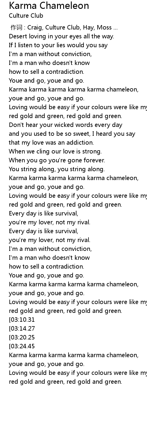 | [02:49.34] | Karma karma karma karma karma chameleon, |