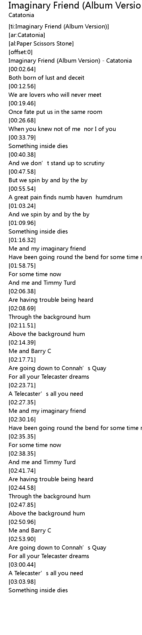 | [00:00.65] | Imaginary Friend (Album Version) - Catatonia |