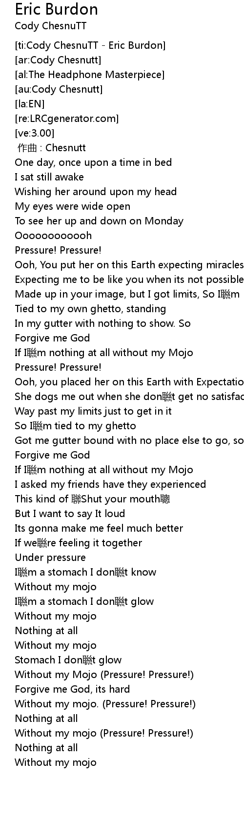 | [02:26.82] | Without my mojo. Pressure! Pressure! |