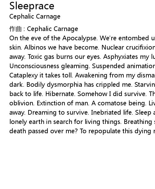 | On the eve of the Apocalypse. We' re entombed underground. Radiation bleaches our skin. Albinos we have become. Nuclear crucifixion eradicates. Obscures the sun away. Toxic gas burns our eyes. Asphyxiates my lungs. Wounded and screaming. Unconsciousness gleaming. Suspended animation overcomes. Six months go by. Cataplexy it takes toll. Awakening from my dismal slumber. I now see well in the dark. Bodily dysmorphia has crippled me. Starving and dehydrated. I claw my way back to life. Hibernate. Somehow I did survive. The only man alive. Spared from oblivion. Extinction of man. A comatose being. Living in a haze. Fortitude slips away. Dreaming to survive. Inebriated life. Sleep another day. I now dwell this lonely earth in search for living things. Breathing still while world died. Why death passed over me? To repopulate this dying race. Rid the planet of hate! |