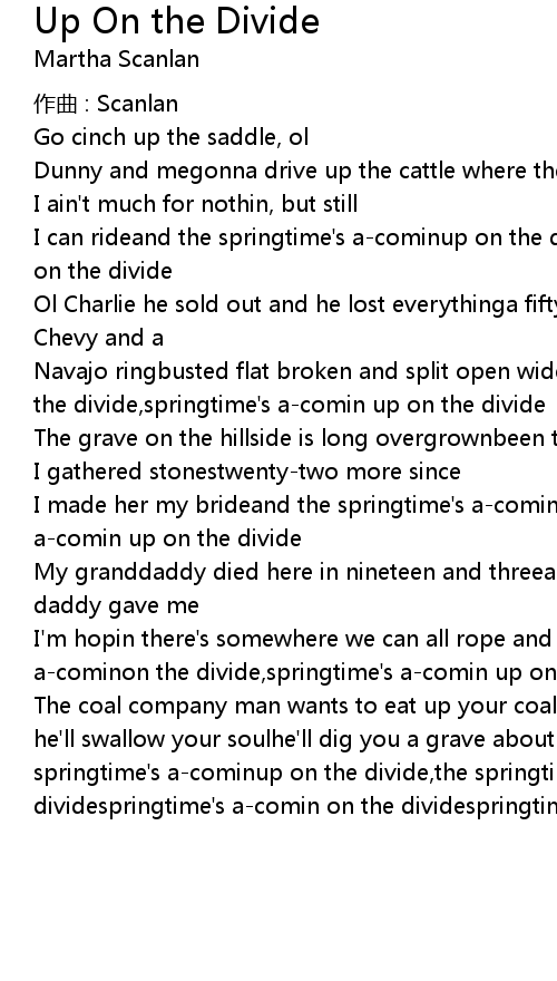 | The coal company man wants to eat up your coalhe'll swallow your cattle, then he'll swallow your soulhe'll dig you a grave about ten acres wideand the springtime's a-cominup on the divide,the springtime's a-comin up on the dividespringtime's a-comin on the dividespringtime's a-comin up on the divide |