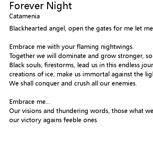 Black souls, firestorms, lead us in this endless journey. blizzard winds, creations of ice, make us immortal against the light. |