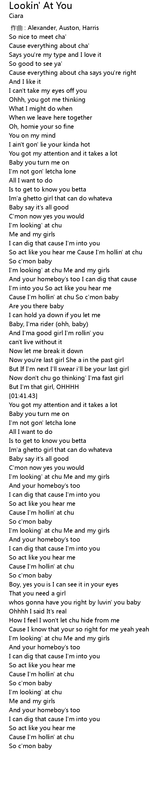 | [02:00.25] | I' m looking' at chu Me and my girls |