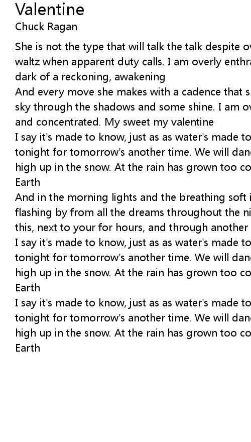 And every move she makes with a cadence that she wakes takes my soul up to the sky through the shadows and some shine. I am overly inclined. I am captivated and concentrated. My sweet my valentine