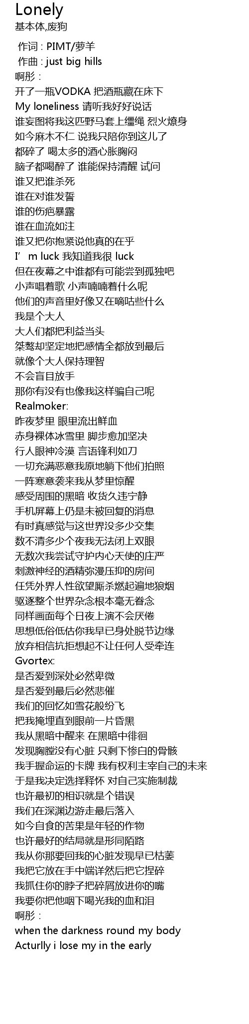 | [00:22.930] | My loneliness qing ting wo hao hao shuo hua |