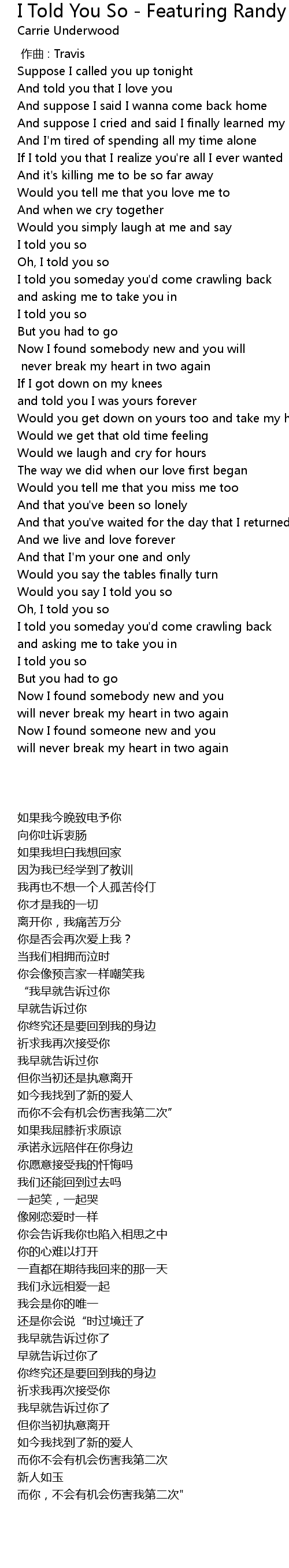 | 歌曲 | I Told You So - Featuring Randy Travis |