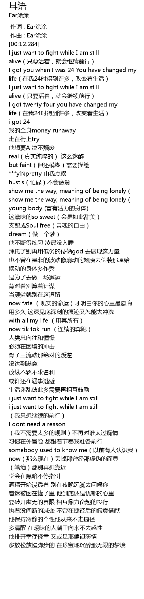 | [00:12.902] | I just want to fight while I am still alive zhǐ yào huó zhe, jiù huì jì xù qián xíng |