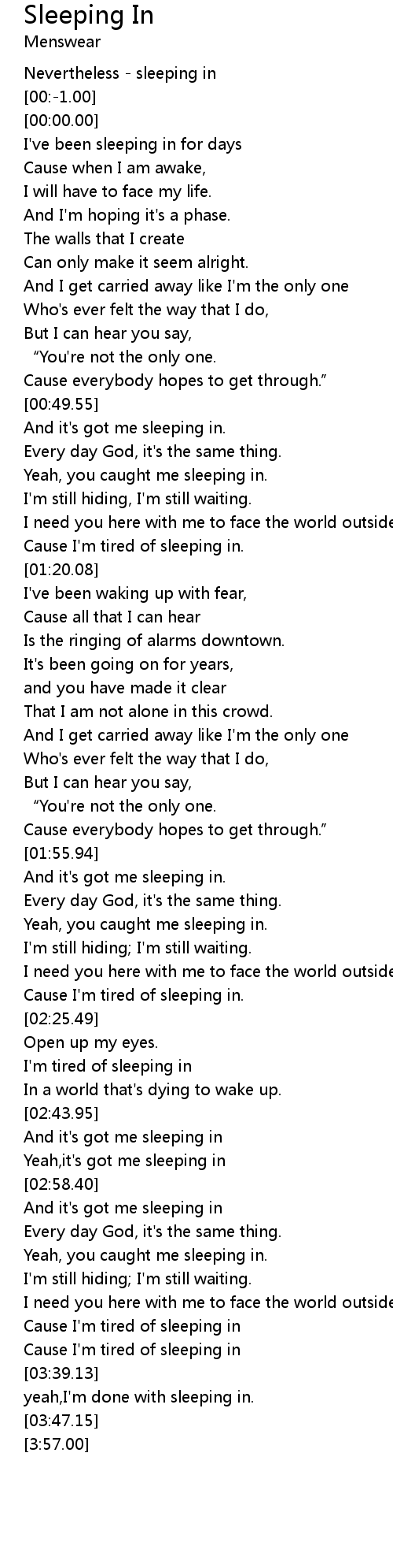 | [03:34.44] | Cause I' m tired of sleeping in |