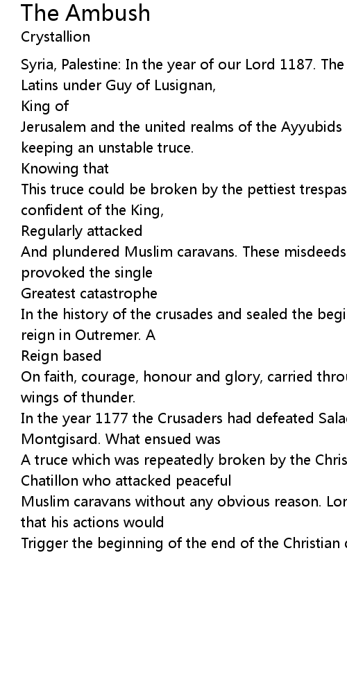 This truce could be broken by the pettiest trespass Lord Raynald of Chatillon, a confident of the King, |