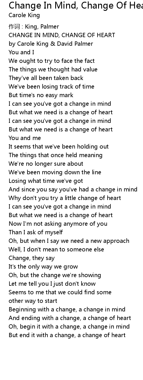 | 歌曲 | Change In Mind, Change Of Heart |