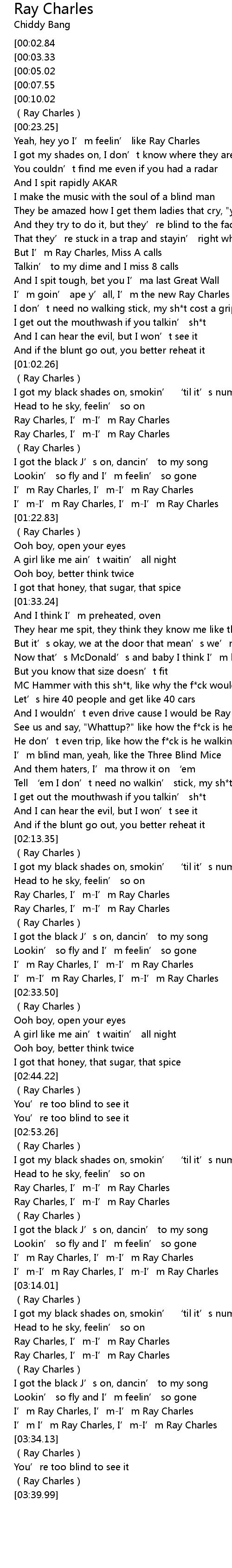 | [00:23.72] | Yeah, hey yo I’m feelin’ like Ray Charles |