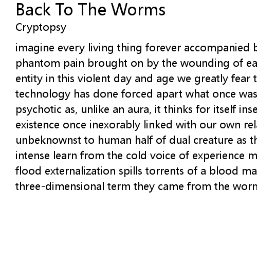 imagine every living thing forever accompanied by an alter dimensional being phantom pain brought on by the wounding of each individual's extracorporeal entity in this violent day and age we greatly fear their coming rage what technology has done forced apart what once was one electropsychic and highly psychotic as, unlike an aura, it thinks for itself inseparable in schizoid existence once inexorably linked with our own relationship of symbiotic nature unbeknownst to human half of dual creature as the phantom empaths whose pain is intense learn from the cold voice of experience mass exodus in an invisible flood externalization spills torrents of a blood man has ended his three-dimensional term they came from the worms let them go back to the worms |