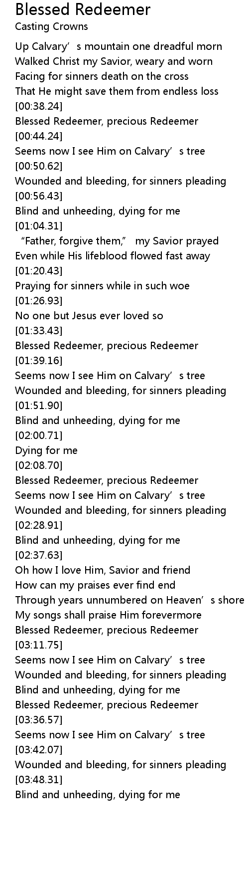 | [01:34.31] | Blessed Redeemer, precious Redeemer |