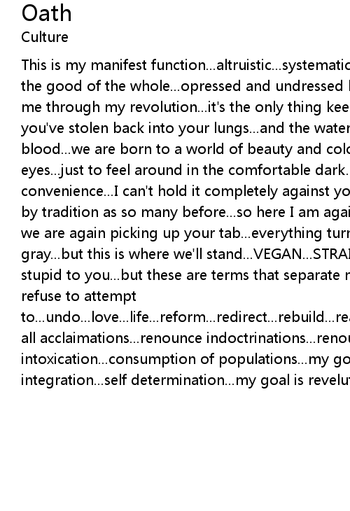 This is my manifest function...altruistic...systematic...I will sacrifice for the good of the whole...opressed and undressed by oligarchic control...so heckle me through my revolution...it's the only thing keeping you alive...I put the air you've stolen back into your lungs...and the water you blacken back into oyur blood...we are born to a world of beauty and color...why must you gouge out your eyes...just to feel around in the comfortable dark...know nothingness of convenience...I can't hold it completely against you...you've been conditioned by tradition as so many before...so here I am again cleaning up your mess...here we are again picking up your tab...everything turns a threatening shade of gray...but this is where we'll stand...VEGAN...STRAIGHT EDGE...terms that seem stupid to you...but these are terms that separate me from the destruction you refuse to attempt to...undo...love...life...reform...redirect...rebuild...reassess...relearn...reinstate...repeal...relive...renounce all acclaimations...renounce indoctrinations...renounce all intoxication...consumption of populations...my goal is liberation...my goal is integration...self determination...my goal is revelution...revolt |